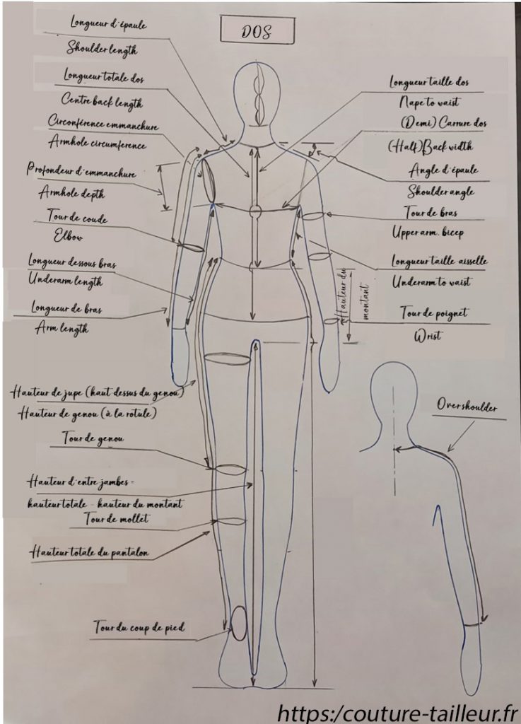 Description des mesures nécessaires à la création de patrons de veste, jupe et pantalon à la mesure..