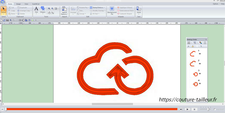 L’opération est assez complexe : pour que la broderie soit facile d’exécution, il faut que le nombre de changements de bobines sur la brodeuse soit réduit au strict minimum ainsi que le nombre de sauts d’aiguille pour avoir un minimum de fils à couper et que le résultat soit propre.