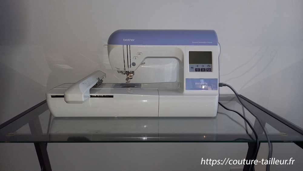 J’ai investi dans une brodeuse INNOVIS 700 IIE de chez Brother. Ses capacités sont limitées en terme de taille de broderie : 10 cm x 10 cm ou 18 cm x 13 cm. J’ai un cadre encore plus grand qui permet éventuellement, en procédant à plusieurs chargements consécutifs, de broder sur une surface un peu plus grande mais, plus le cadre est grand, plus est est difficile de maintenir le tissu en tension donc plus le risque de déformer (resserrer) le tissu est important à cause de la tension générée par les fils : si la broderie nécessite de passer plusieurs fois au même endroit avec des fils de couleurs différentes, cela va poser des problèmes d’alignement et le résultat ne sera pas satisfaisant.